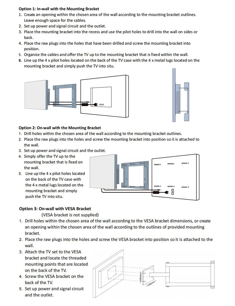 For the models that are designed to be installed and recessed into your wall. It therefore requires a cavity to be cut into your wall, with size of cavity depend on the size of television you purchase. It is recommended that power and input cables are made available adjacent to the cavity opening inside the cavity. This will give you a seamless looking installation.